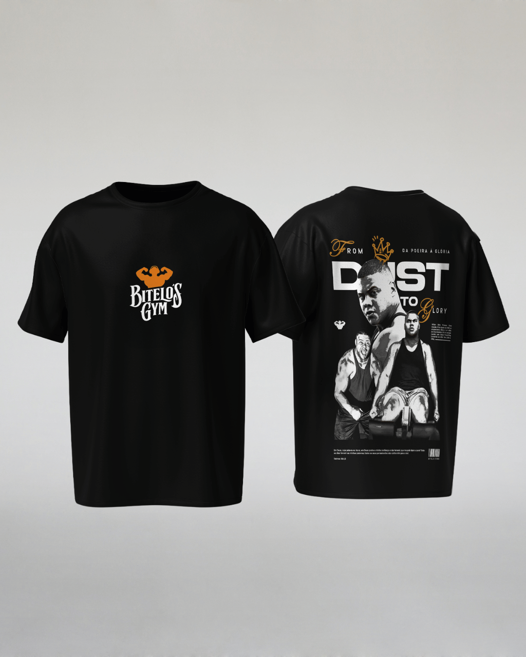 Inspirada na trajetória do Bitelo — do chão da obra e da academia à conquista da glória —, a camiseta “Da Poeira à Glória” representa força, fé e superação.